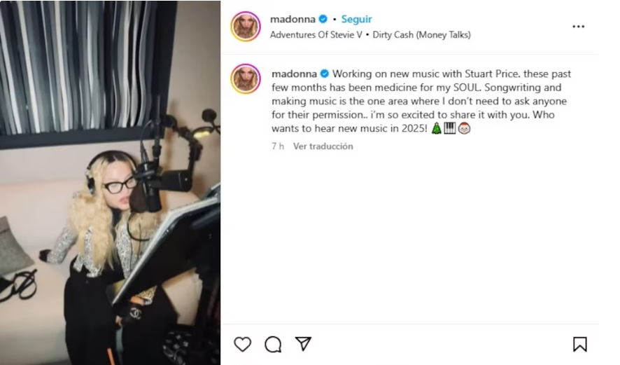 “Trabajando en nueva música con Stuart Price. Estos últimos meses han sido medicina para mi ALMA. Escribir canciones y hacer música es la única área en la que no necesito pedirle permiso a nadie. Estoy tan emocionada de compartirlo contigo. ¡Quién quiere escuchar música nueva en 2025!”, redactó.